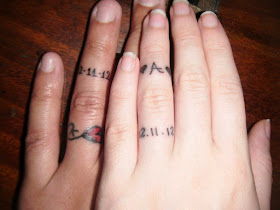 We each designed our own tattoo and included the date of our marriage (12/11/12). We designed them to be just like a ring going around our fingers with the date on the outside and a little personal design on the inside. Mine had a letter A with a heart on either side and Armando's was in the shape of an infinite sign but with a heart on one side and a K on the other.